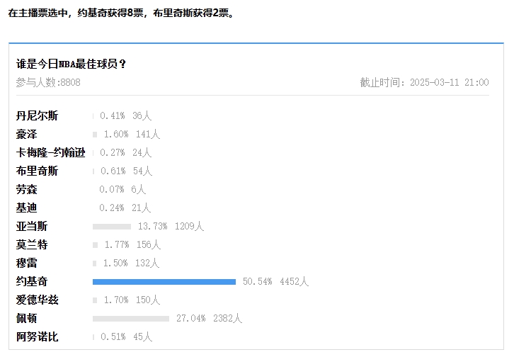 在主播票选中,约基奇获得8票,布里奇斯获得2票。