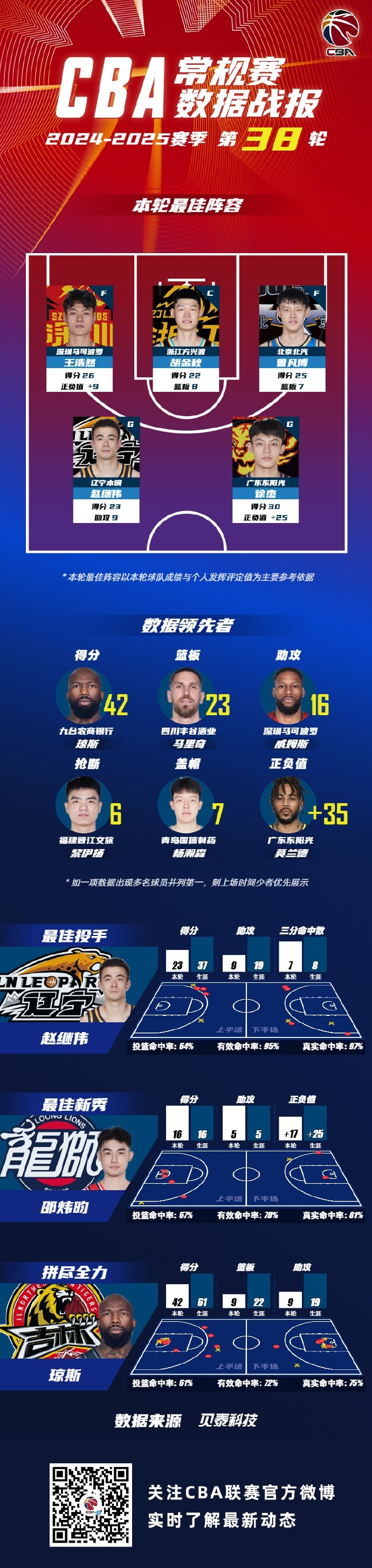 2024-2025赛季CBA联赛常规赛第38轮结束较量,来自深圳新世纪烈豹篮球俱乐部的王浩然,浙江广厦篮球俱乐部的胡金秋,北京首钢篮球俱乐部的曾凡博,辽宁沈阳三生飞豹篮球俱乐部的赵继伟和广东宏远篮球俱乐部的徐杰入选CBA联赛常规赛第38轮最佳阵容!