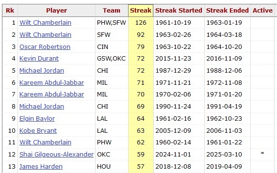 2025-03-13 15:11:34亚历山大成NBA历史第8位连续60场砍20+球员 比肩大帅乔丹科比KD