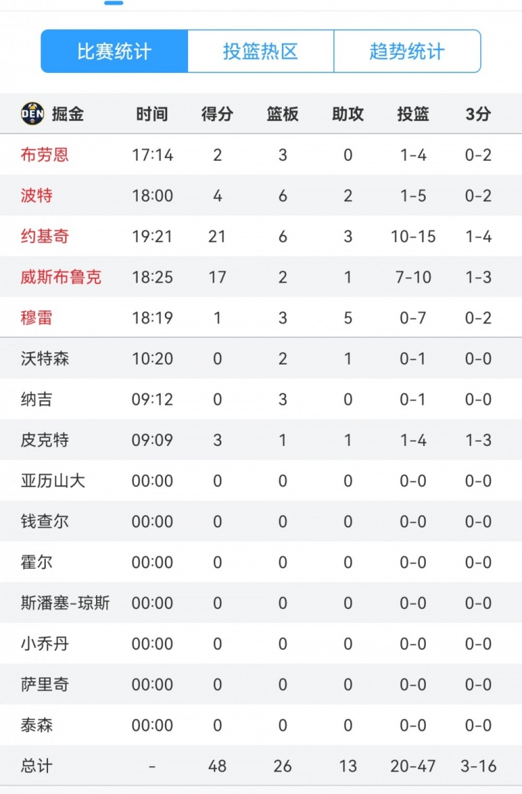 2025-03-13 15:13:31都是卧底?掘金全队除约基奇和威少外合计22投3中 穆雷7中0