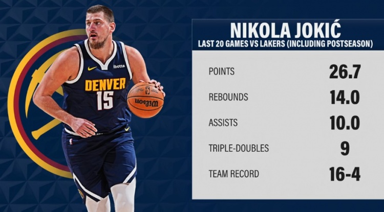 2025-03-15 16:28:47约基奇过去20场对阵湖人:场均26.7分14板10助&9次三双 16胜4负