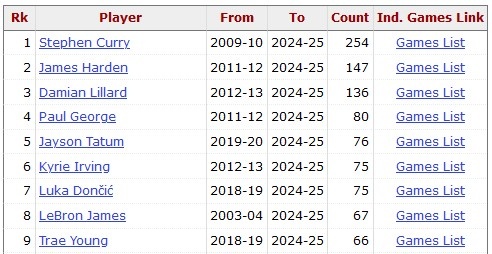 2025-03-19 16:46:51吹杨生涯67次至少30分+5三分 与詹姆斯并列历史第8&库里断档第一