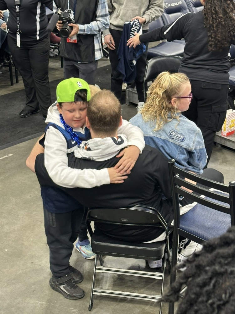 本场比赛,森林狼老将乔·英格尔斯12岁的自闭症儿子雅各布,在家人的陪同下来到了现场观看父亲的比赛。森林狼主教练贴心地将英格尔斯安排进了首发,这也是自2021-22赛季,英格尔斯首次首发,当时他还在爵士队。
