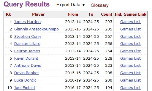 2025-03-22 15:30:282014年至今联盟球员30+场次数榜:哈登294第一 字母第二 库里第三
