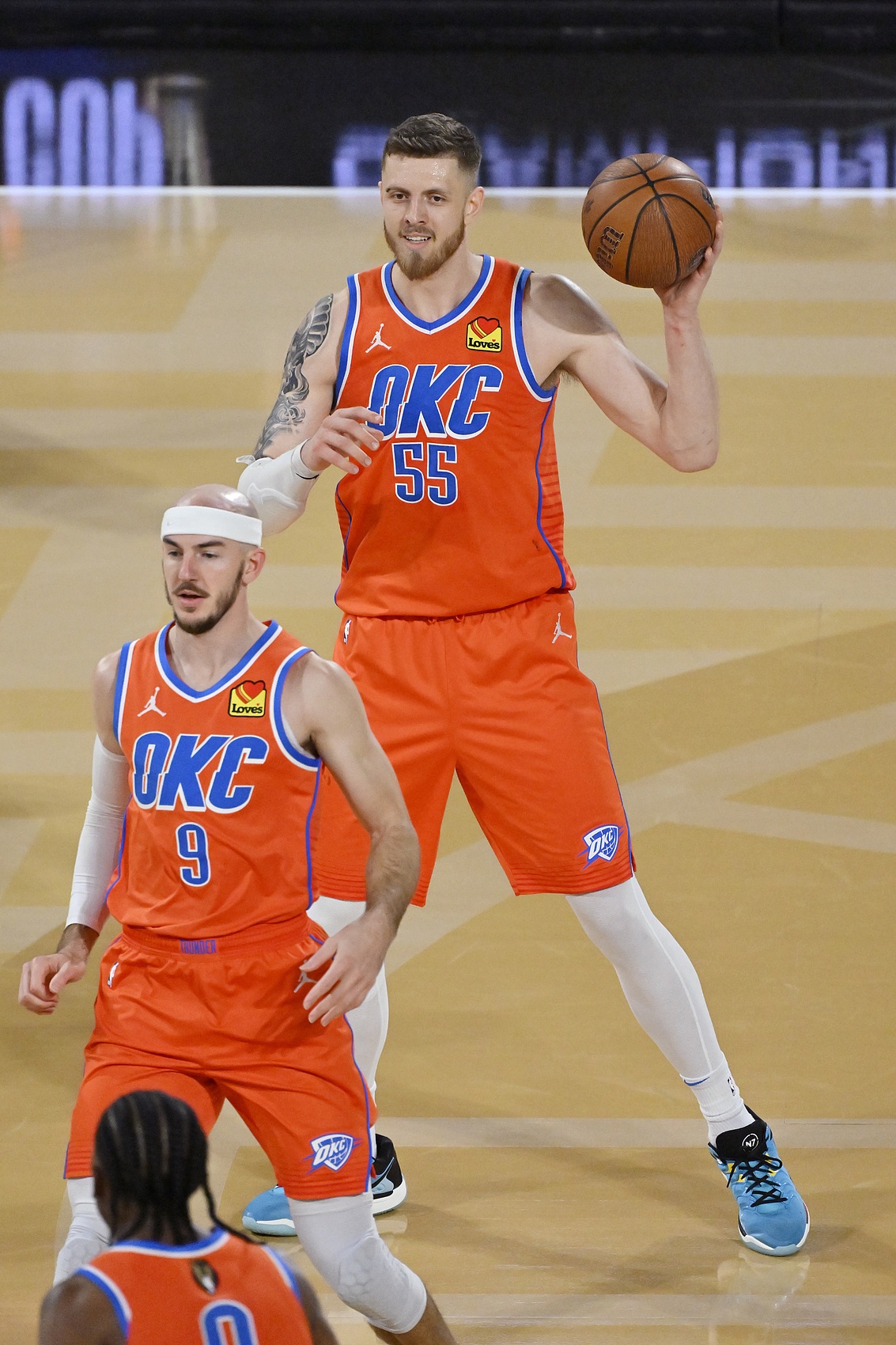 2023-24赛季,戴格诺特教练带着25岁的亚历山大、22岁的杰伦-威廉姆斯、21岁的霍姆格伦、24岁的多特、21岁的基迪、20岁的卡森-华莱士、21岁的杰林-威廉姆斯、24岁的以赛亚-乔、25岁的阿隆-维金斯、29岁的肯里奇-威廉姆斯更进一步,他们进攻效率第3、防守效率第4,常规赛豪取57胜25负,登顶西部第一!