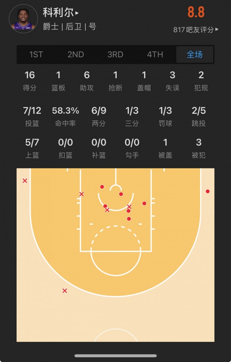 爵士29号秀 以赛亚-科利尔 登场30.6分钟