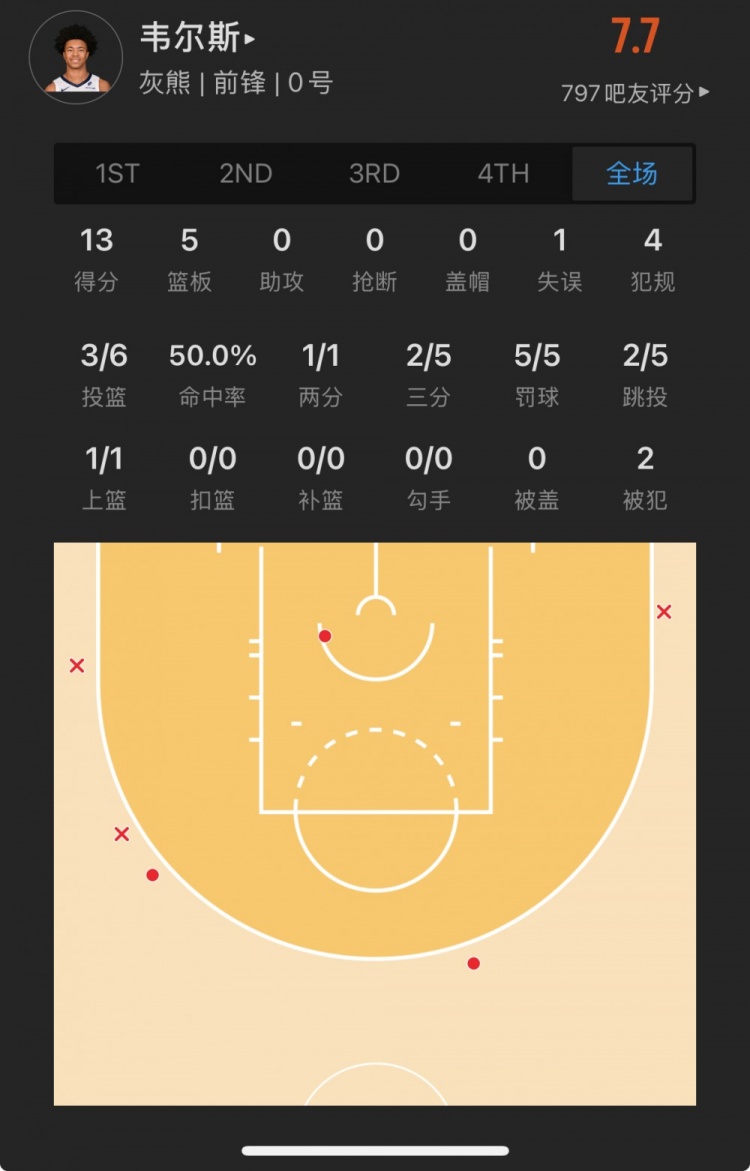 灰熊39号秀 杰伦-韦尔斯 登场28.2分钟