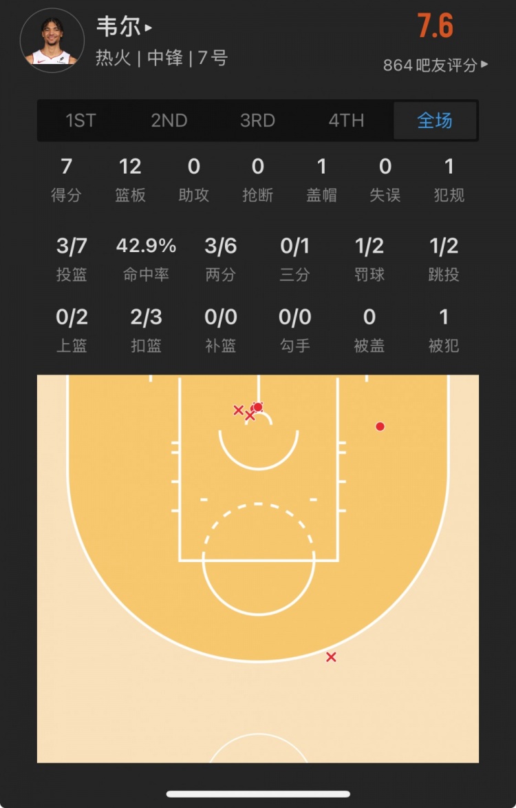 热火15号秀 克雷尔-韦尔 登场21.4分钟