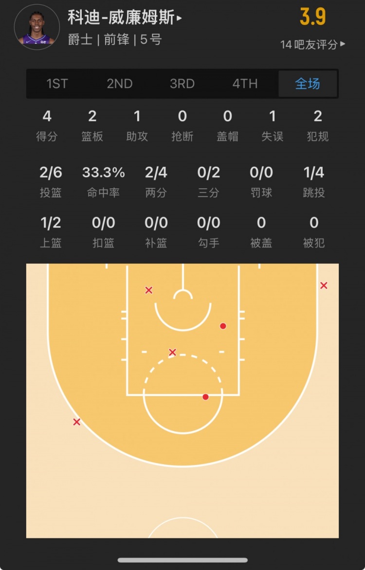 爵士10号秀 科迪-威廉姆斯 登场20.4分钟