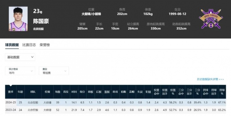 陈国豪今年效率还行,但出场机会被萨林杰+沈梓捷进一步挤压