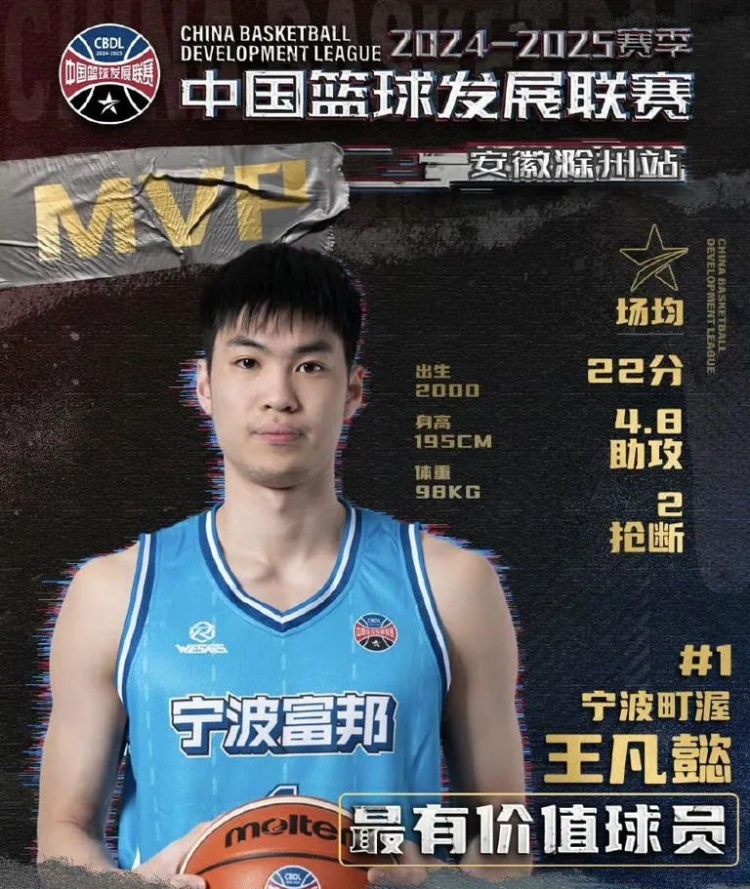 于是,王凡懿就只能去CBDL发光发热了,不出意料的是,他在这里如鱼得水……第二阶段滁州站比赛,宁波在他的带领下6战全胜,王凡懿也以场均22分4.8助攻2抢断收获赛事MVP……