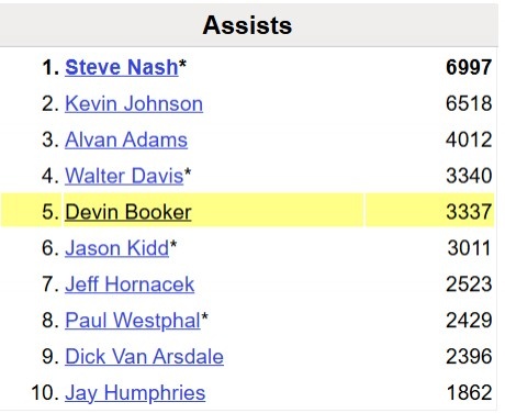 2025-02-26 14:11:30✅布克太阳生涯助攻数达到3341 超越沃尔特-戴维斯升至队史第4