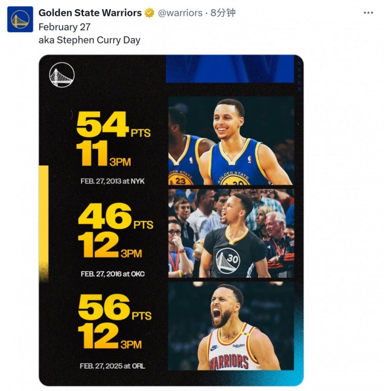 2025-02-28 14:10:4613年&16年的今天也有神级表现!勇士官推:2月28日亦称“库里日”