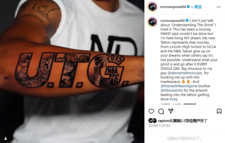 “Understand the Grind (理解磨砺)”一直都是诺曼-鲍威尔所秉持的人生信条,它以“UTD”的形式纹在了鲍威尔投篮手的小臂上,陪他一起面对所有挑战。