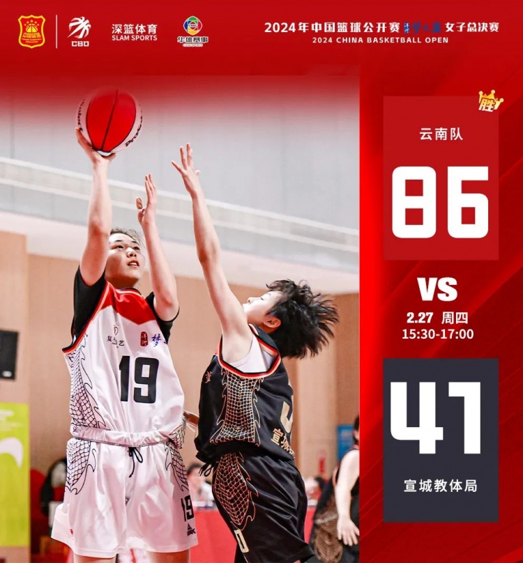 两连胜的云南队,本轮对阵实力相对较弱的宣城教体局。上半场,云南队打出一波11-0的得分潮。落后的宣城教体局在技术上稍显稚嫩,半场结束,云南队43-14宣城教体局。下半场,宣城教体局命中率有所提高,但面对云南队还是存在很大差距,最终,云南队86-41战胜宣城教体局。