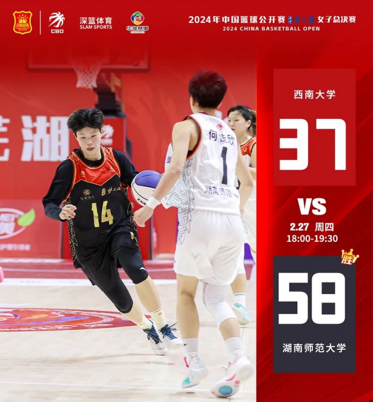 上半场,在开局短暂僵持后,湖南师范大学开始进攻,15号刘嘉芳后场篮板拼抢积极,6号沈思榆、1号何佳欣两分命中,湖南师范大学22-8领先西南大学。次节湖南师范大学继续高歌猛进,多次抢断快攻打成。半场结束,湖南师范大学36-20领先。下半场,西南大学手感欠佳,两节只得到17分,最终湖南师范大学58-37战胜西南大学。