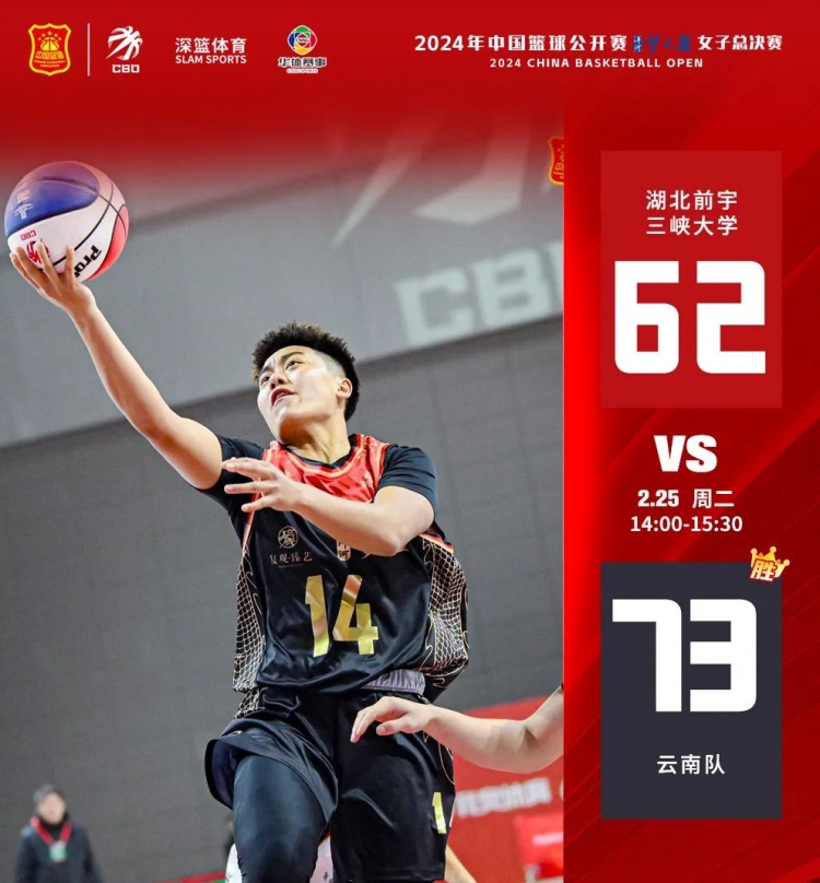 首场比赛由湖北前宇三峡大学对阵云南队,上半场开局,两队打得相对胶着,比分紧咬至6平。随后湖北前宇三峡大学加强防守,8号漆采篮下强势,反击中4号卫香羽、5号陆婷接连篮下得分,湖北前宇三峡大学16-9领先。落后的云南队,不断通过外线寻找机会,14号娜汉三分命中,帮助球队逐渐追平并反超比分。首节结束,云南队22-20领先湖北前宇三峡大学。次节,两队进攻火力不减,湖北前宇三峡大学5号陆婷依旧手感火热,云南队14号娜汉也不甘示弱。半场结束,云南队39-37领先湖北前宇三峡大学。下半场,随着体力的下降,两队进攻成功率都所有降低,湖北前宇三峡大学陷入短暂的得分荒,反观云南队在14号娜汉、6号罗菲的带领下,多次反击快攻得手,最终云南队73-62战胜湖北前宇三峡大学。