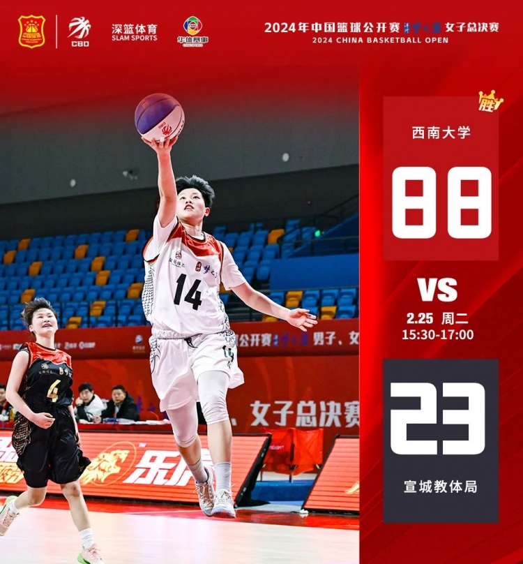 第二场由西南大学对阵宣城教体局,两队之间还是存在一定的实力差距。上半场,西南大学开场打出了一波16-0的得分潮,奠定领先优势。宣城教体局面对西南大学的防守,很难取得有效得分手段。半场结束,西南大学47-15领先宣城教体局。易边再战,西南大学进攻依旧表现强势,17号冯艺、7号应茵、10号李汶璐频频出手得分,最终,西南大学88-23战胜宣城教体局。