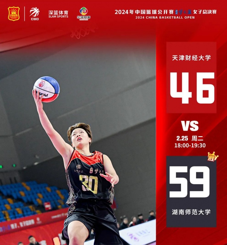 第三场比赛由天津财经大学对阵湖南师范大学,上半场比赛开始,两队便火药粉十足,均表现出了强大的防守能力,首节天津财经大学14-15湖南师范大学。次节,天津财经大学全员手感不佳,湖南师范大学趁势打出一波得分的小高潮。半场结束,湖南师范大学38-22领先天津财经大学。下半场,天津财经大学及时调整,奋起直追。8号夏荣三分命中,天津财经大学追至34-44,湖南师范大学稳扎稳打,最终湖南师范大学59-46战胜天津财经大学。