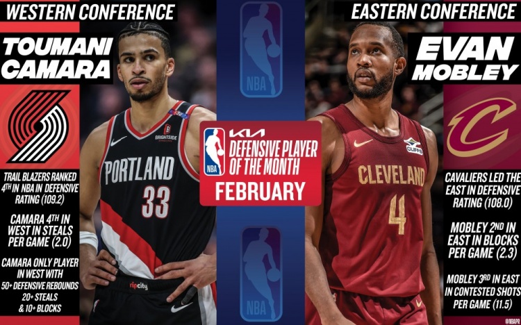 3月5日讯 今日NBA官方今日宣布,开拓者队前锋图马尼-卡马拉和骑士中锋小莫布里当选2月份西部和东部最佳防守球员。