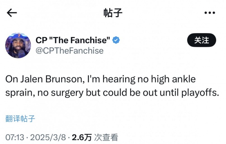 2025-03-08 09:11:03尼克斯博主:我听说布伦森无需接受手术 但可能要缺席至季后赛前