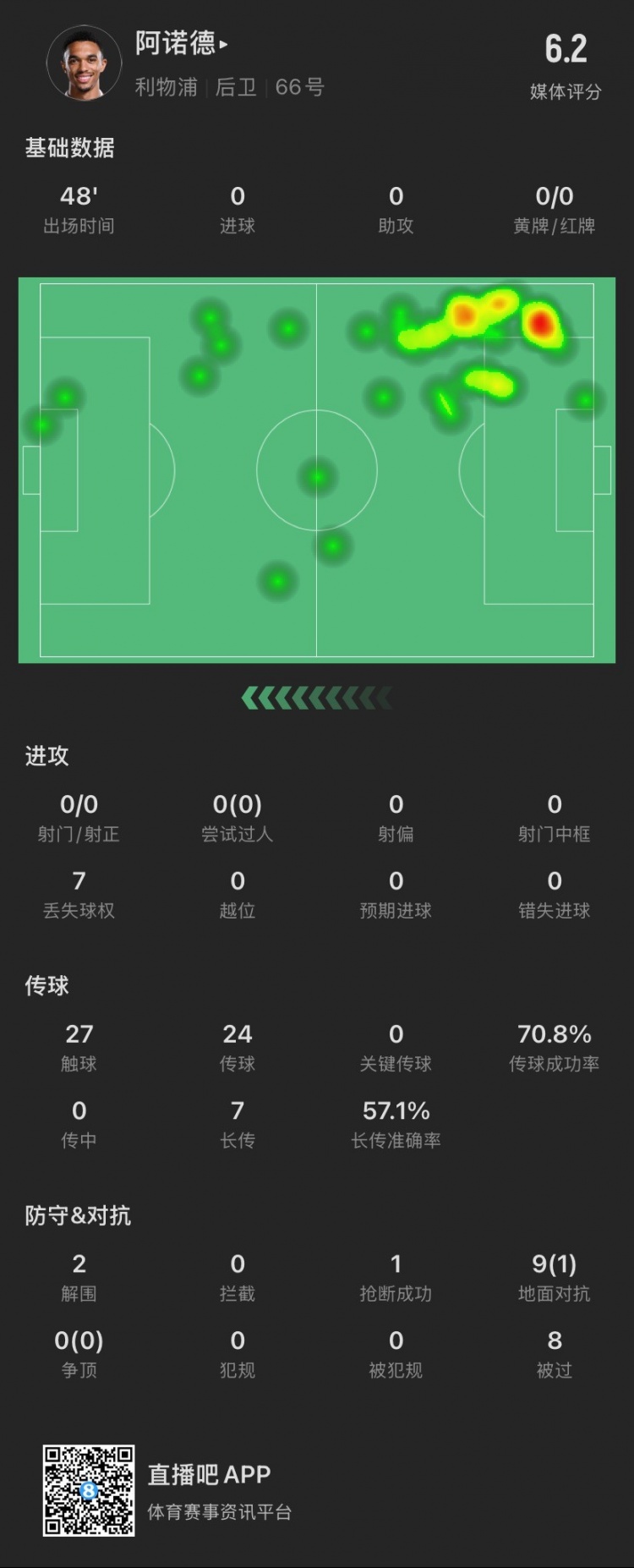 2025-02-24 14:04:10阿诺德半场:被过8次追平本赛季纪录,9次对抗成功1次,贡献2解围