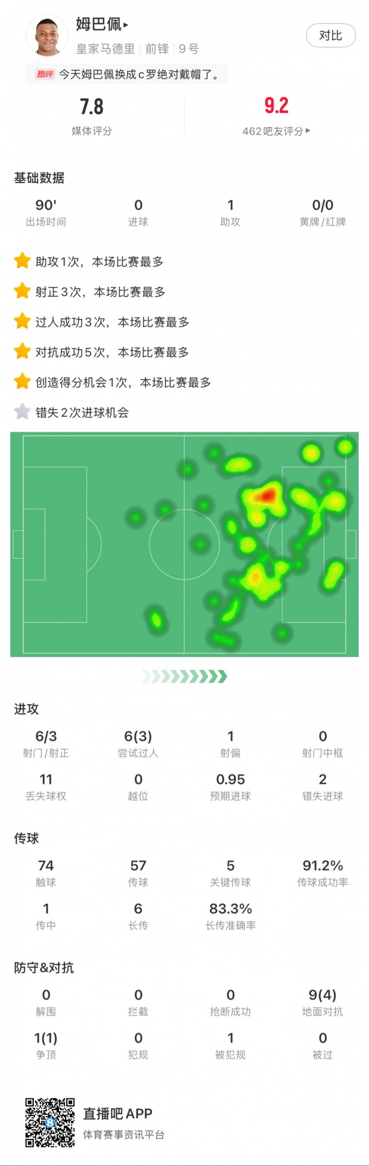 2025-02-24 14:04:17姆巴佩本场数据:1次助攻,6射3正,2次错失得分机会,3次过人