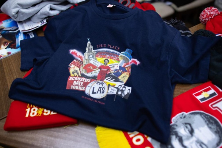 在距离利物浦主场安菲尔德只有5分钟步行路程的一家商店里,你可以看到当地正在出售一件30镑的T恤,上面印有目前利物浦这座城市的标志:乐队披头士和The La's、地标性建筑皇家利物大厦和利物浦电台城塔,以及萨拉赫。