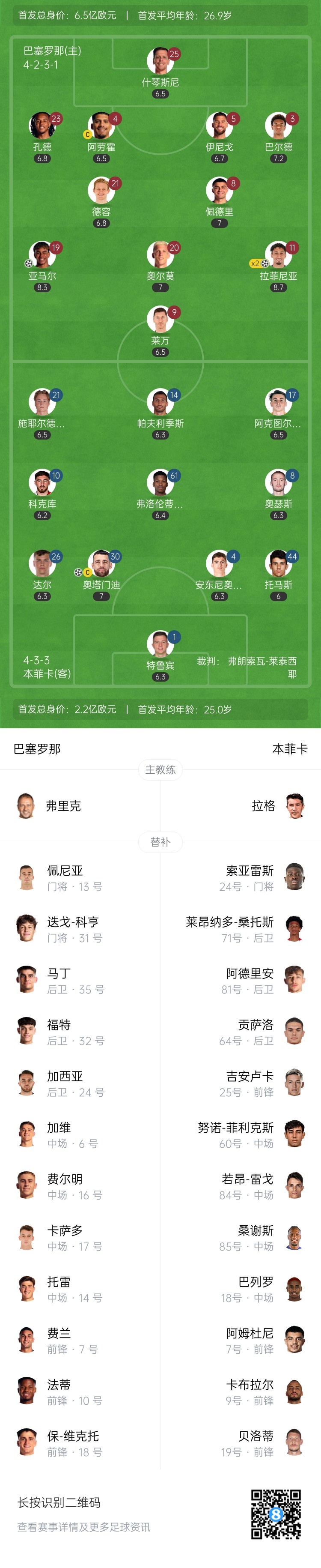 2025-03-12 03:18:11半场-巴萨3-1本菲卡总比分4-1领先 亚马尔传射拉菲尼亚双响