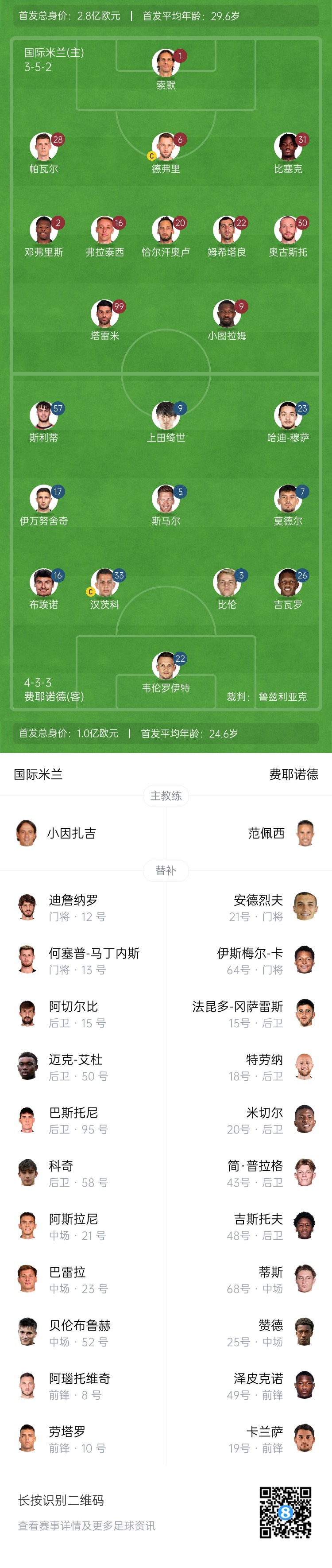 国米首发:1-索默、28-帕瓦尔、6-德弗里、31-比塞克、2-邓弗里斯、16-弗拉泰西、20-恰尔汗奥卢、22-姆希塔良、30-奥古斯托、99-塔雷米、9-图拉姆