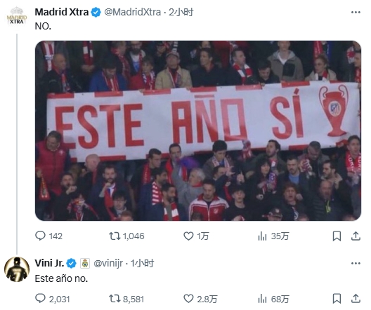 2025-03-13 11:52:19马竞球迷举横幅:欧冠就今年了!维尼修斯社媒评论:今年已无