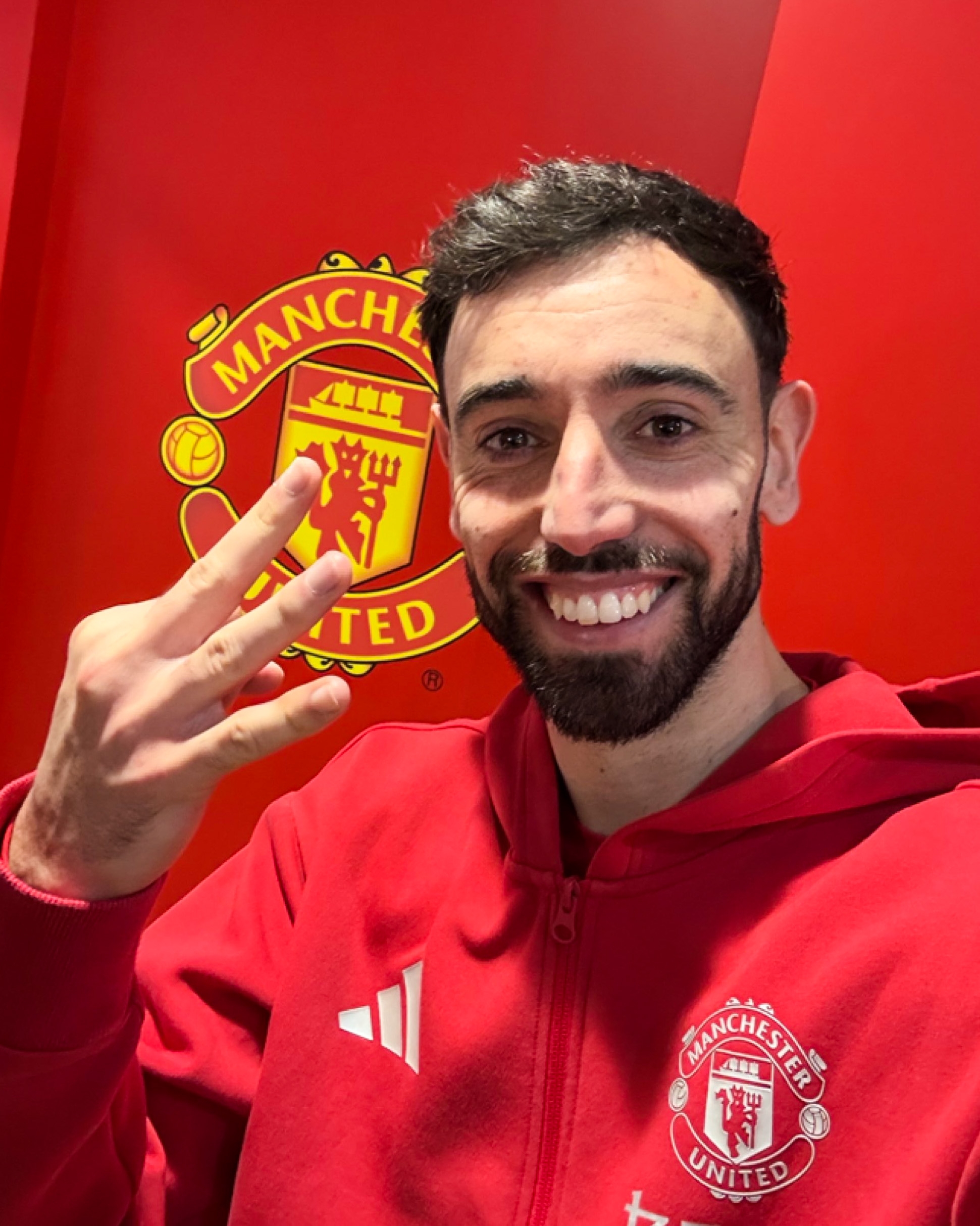2025-03-14 10:53:00带队晋级!欧联杯官推赛后晒B费自拍照,伸出3根手指象征戴帽