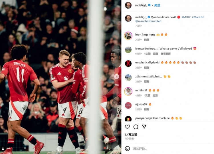 2025-03-14 10:53:17开场送点!德里赫特社媒和队友相拥庆祝照:晋级八强战!