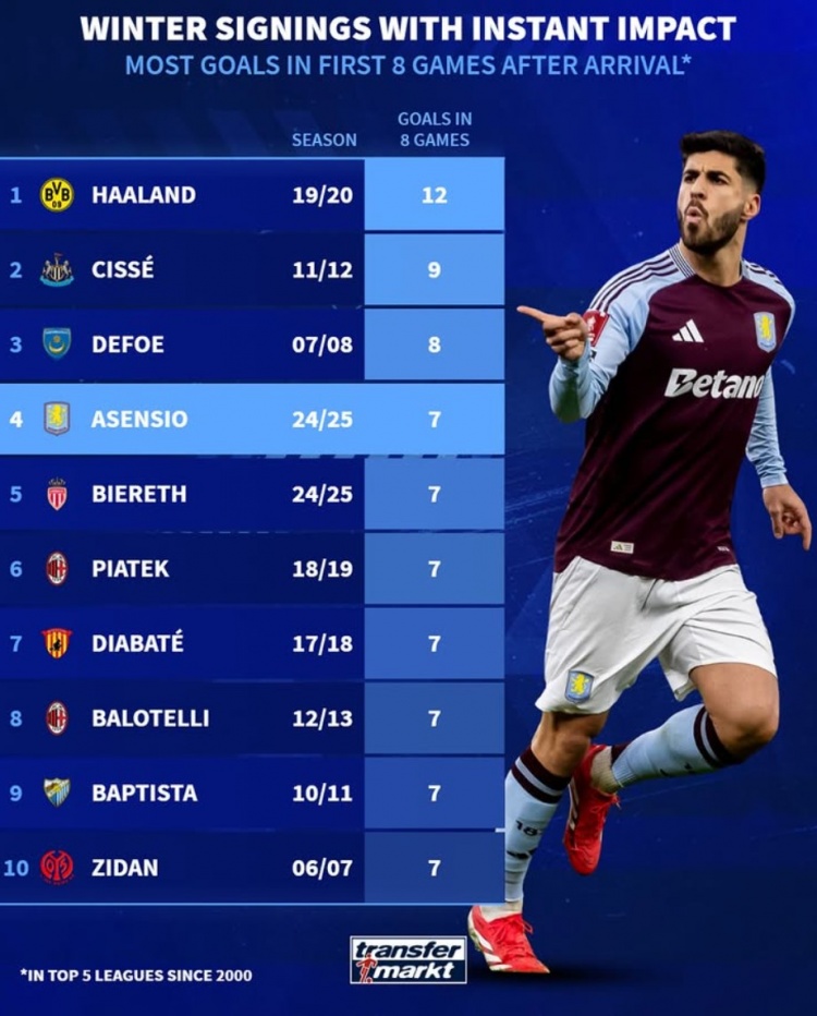 2025-03-15 22:19:05新世纪五大联赛冬窗新援前8场:哈兰德12球 阿森西奥&皮亚特克7球