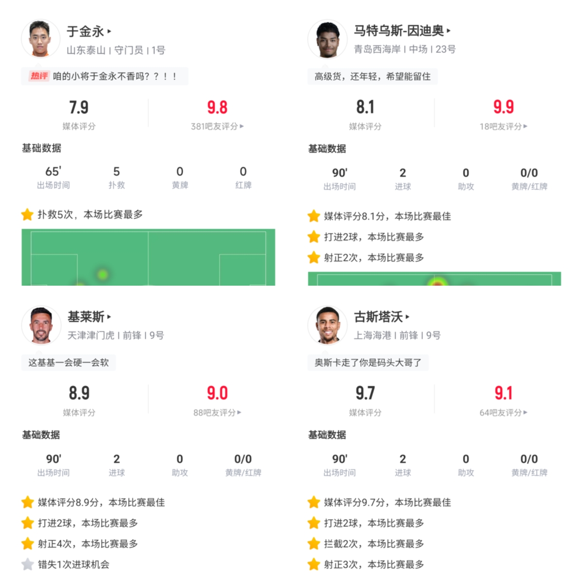 2025-02-24 21:05:01【直播吧】中超首轮最佳球员:于金永险胜,得票率仅多基莱斯1.7%