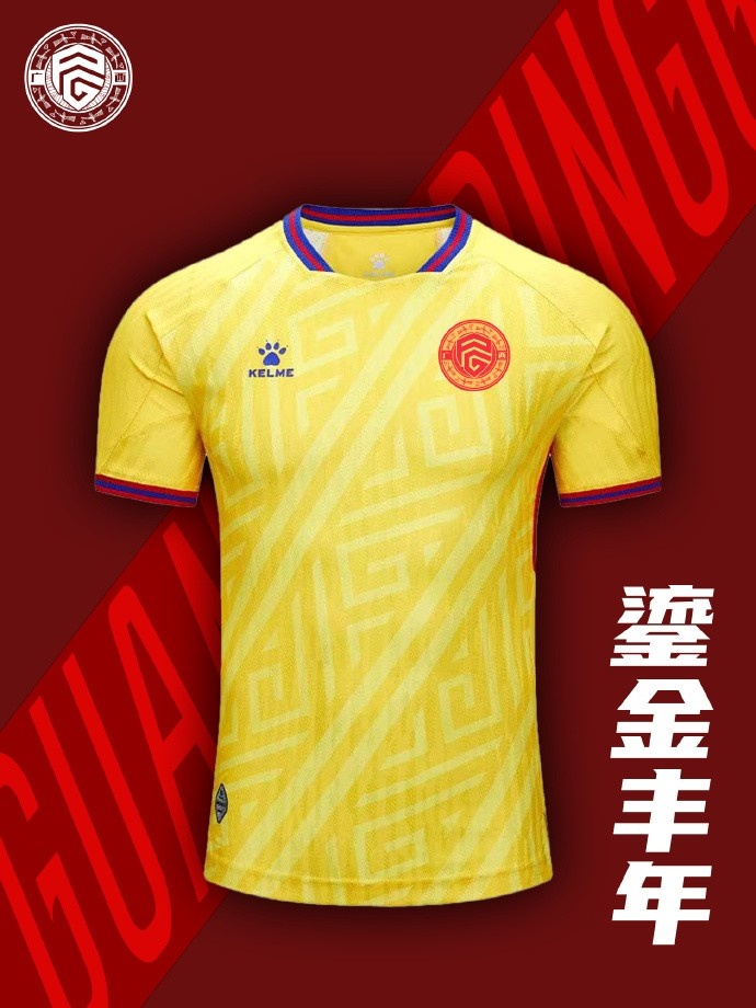 全新客场球衣以八桂大地的丰收盛景为灵感,采用通体金黄色设计,斜纹壮锦暗藏千年智慧,非遗蓝染如右江碧波轻点袖间。黄色象征着丰收与希望,也预示着球队在新赛季中将如金色闪电般迅捷,以灵活的战术和精准的配合,在客场征战中收获胜利的果实。远征之时,让每一道褶皱都闪耀文明之光,每一道斜纹都仿佛在诉说着球队坚韧不拔的精神,无论面对何种挑战,都将勇往直前,势不可挡!