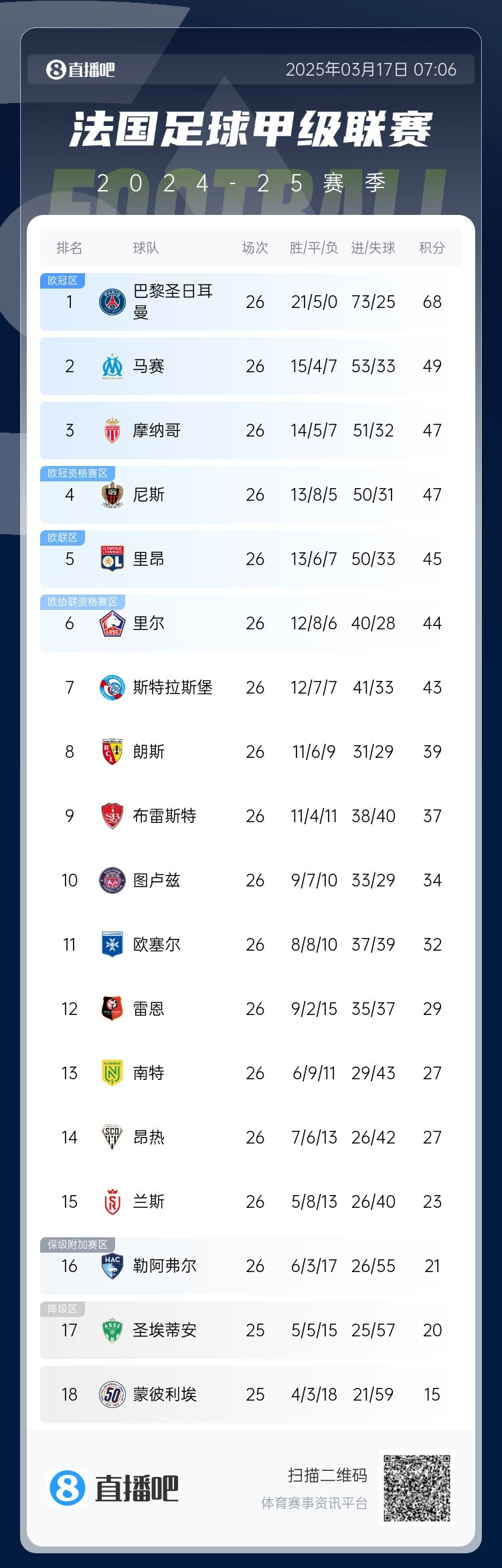 2025-03-17 15:43:30法甲榜首对决获胜&领先19分,巴黎最快下一轮就能提前夺冠