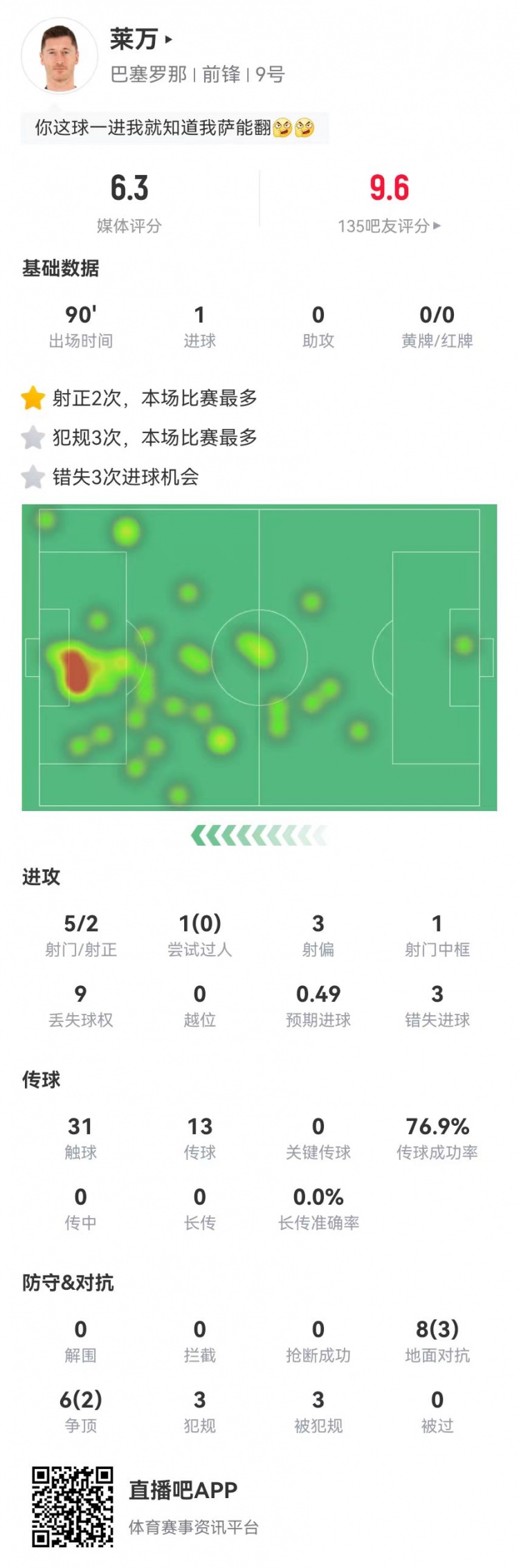 2025-03-17 15:45:48莱万本场5射2正 1球3失良机 14对抗5成功 3犯规3造犯规 仅获6.3分