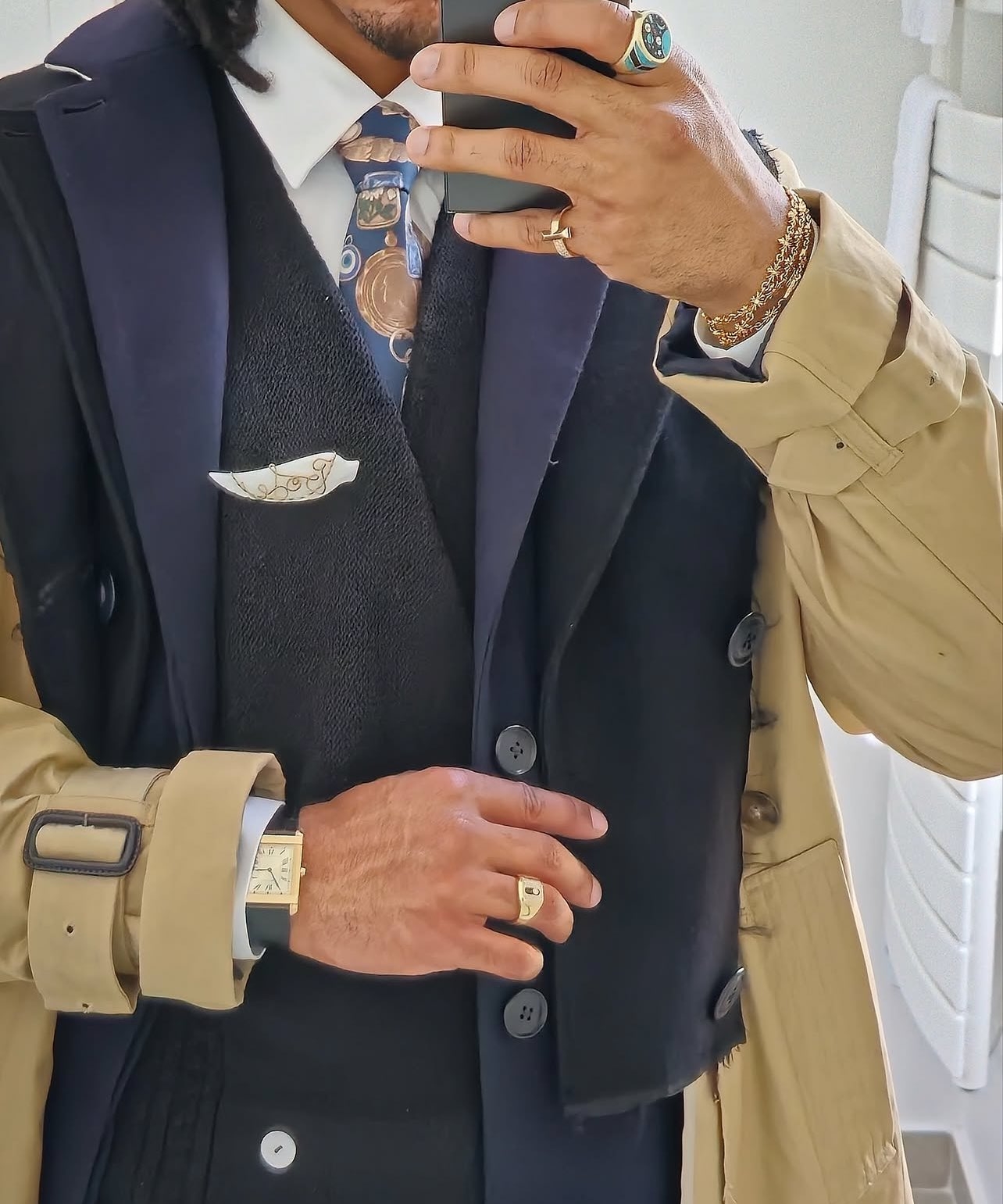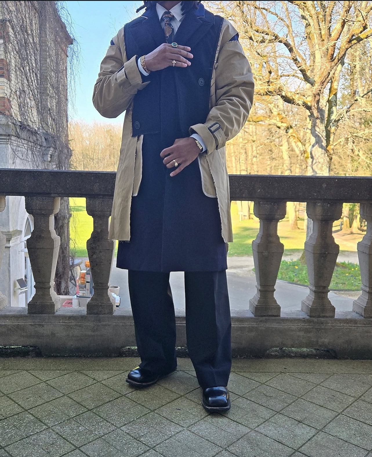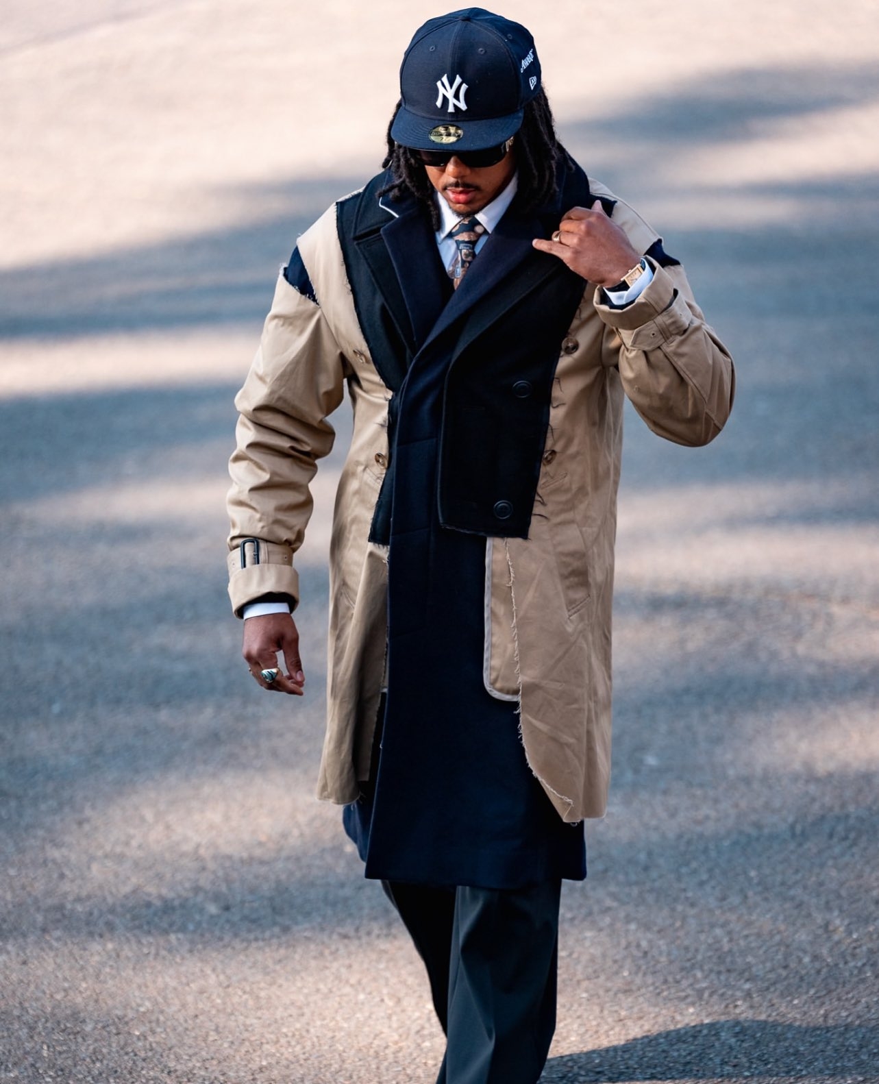 这一次孔德的穿搭中,最引人注目的就是他身上的拼接外套,这件大衣来自日本小众设计师品牌FACETASM,是2022-23的秋冬系列中的一件。