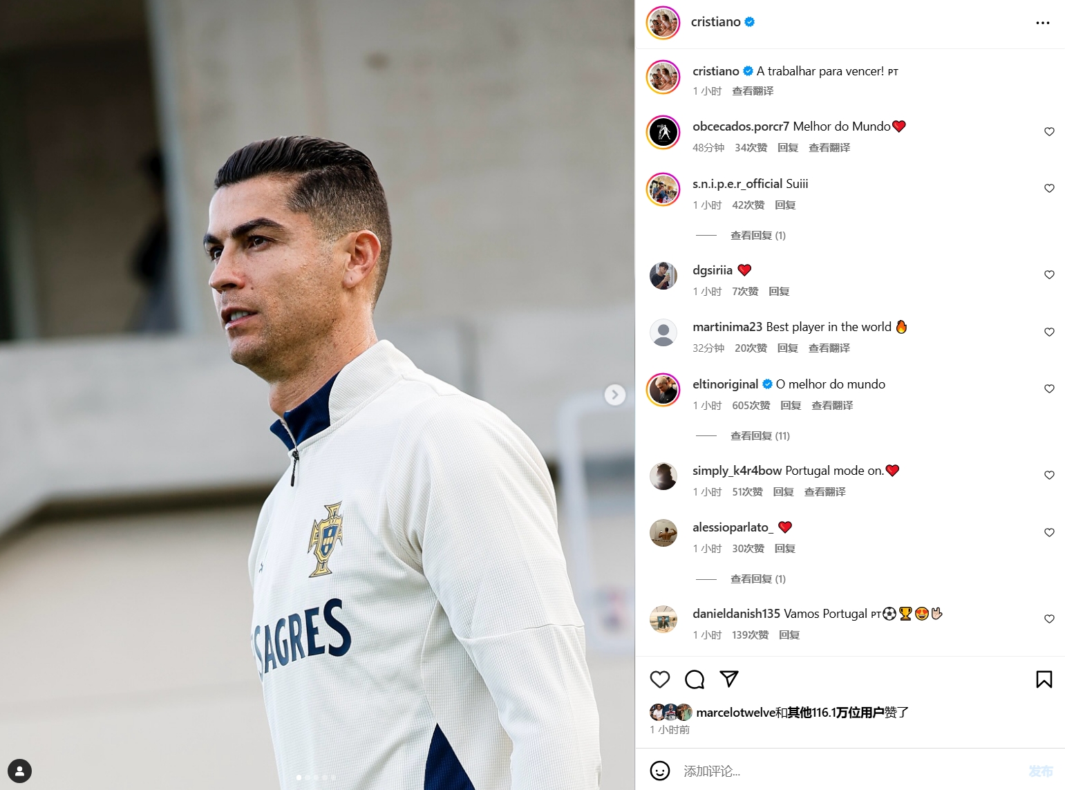 2025-03-19 14:46:18即将对阵丹麦!C罗晒葡萄牙队训练照:为了胜利而工作!