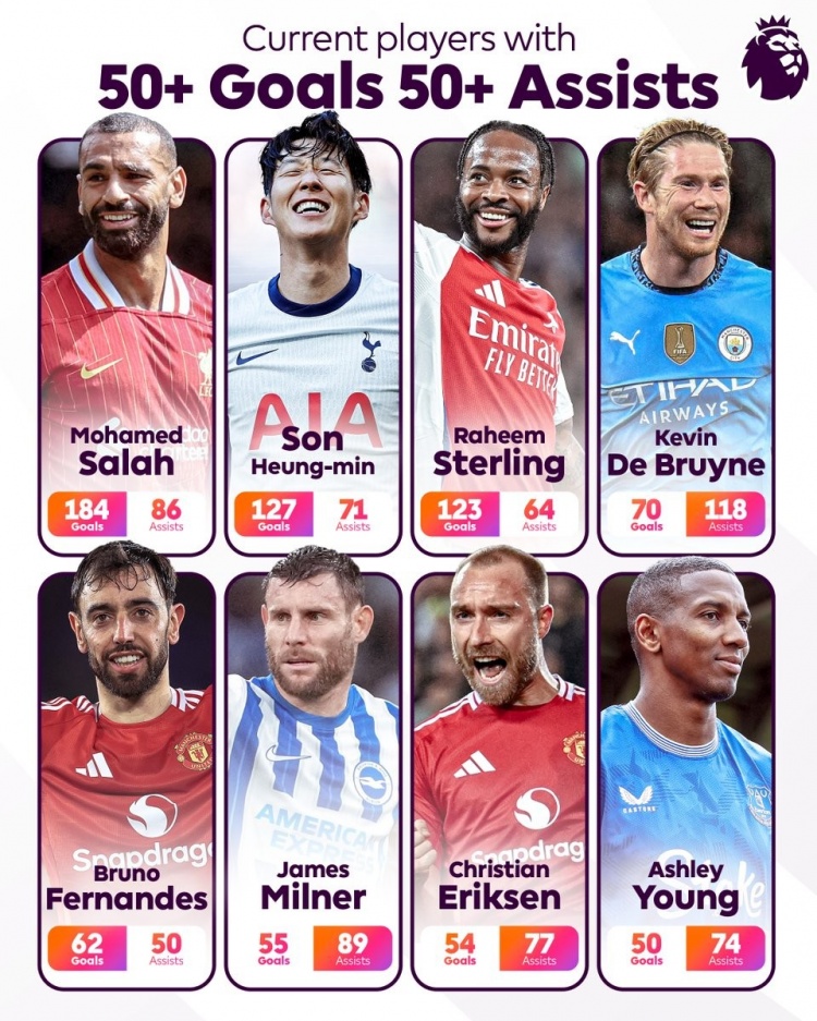 2025-03-19 14:46:20英超当前有8人进球助攻均50+:萨拉赫领衔,孙兴慜、B费在列