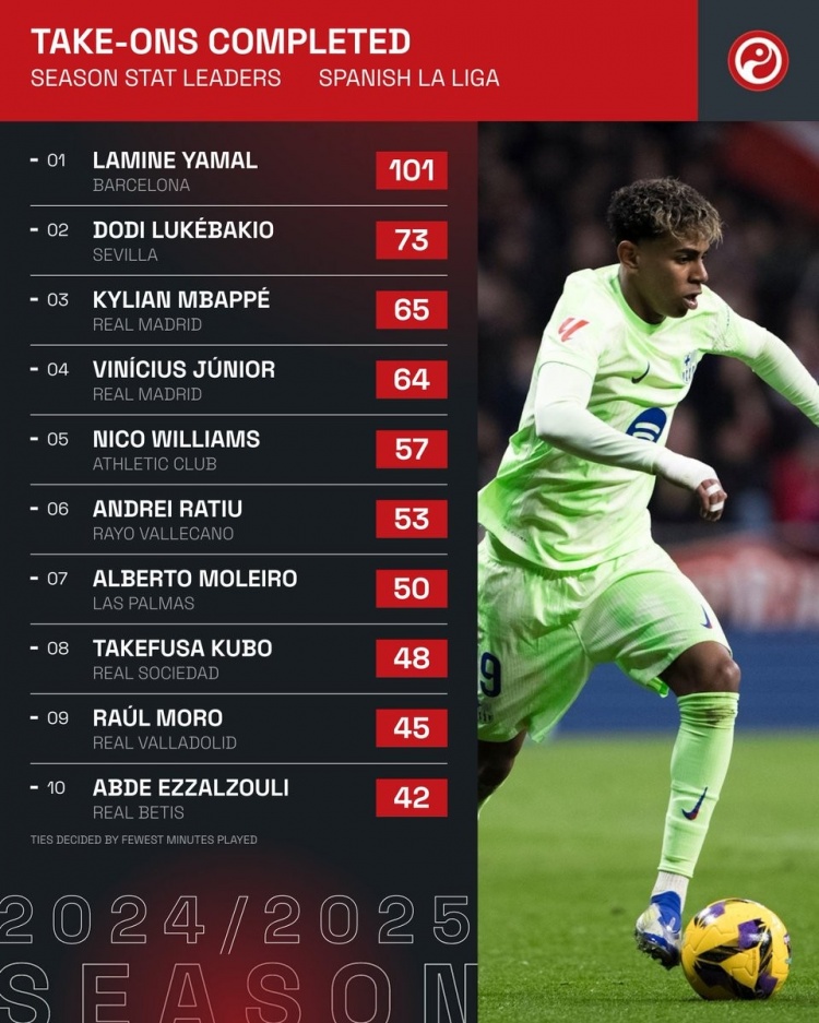 2025-03-19 14:47:54本赛季西甲成功过人榜:亚马尔断崖领跑,姆巴佩、维尼修斯在列