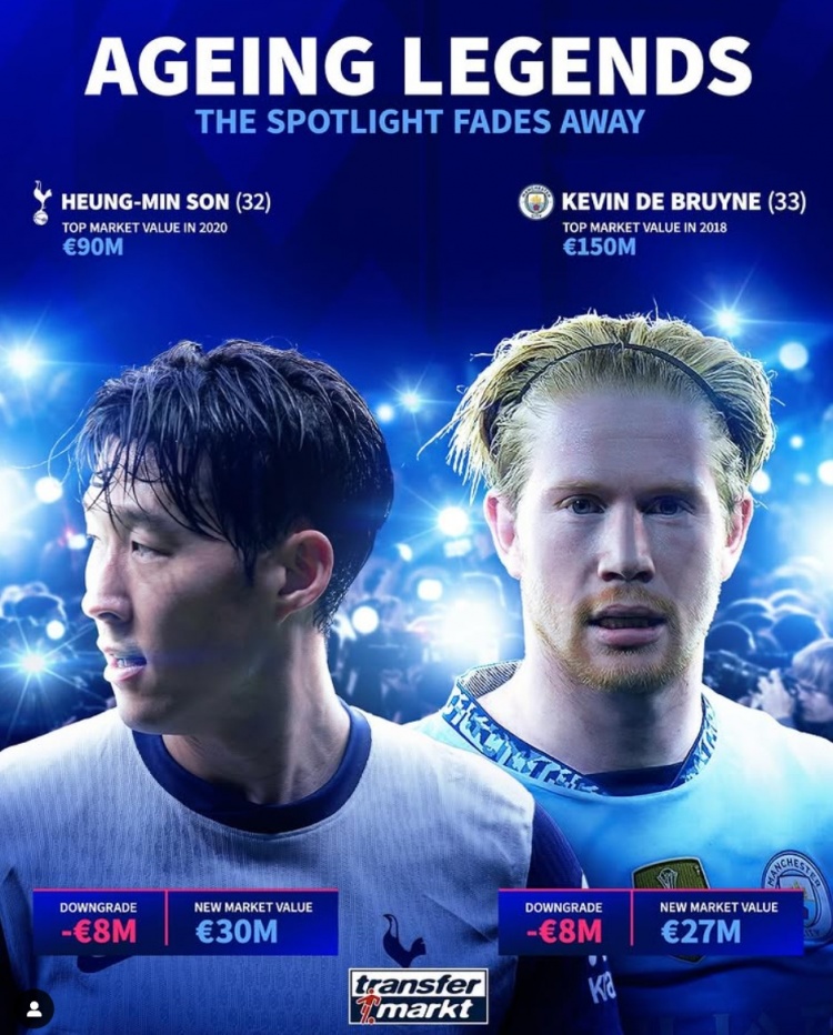 2025-03-19 14:48:5832岁孙兴慜&33岁德布劳内身价各降800万欧,巅峰身价9千万&1.5亿