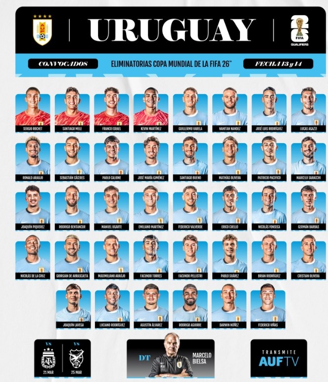 2025-03-19 14:50:53乌拉圭大名单:努涅斯、巴尔韦德、乌加特、本坦库尔入选