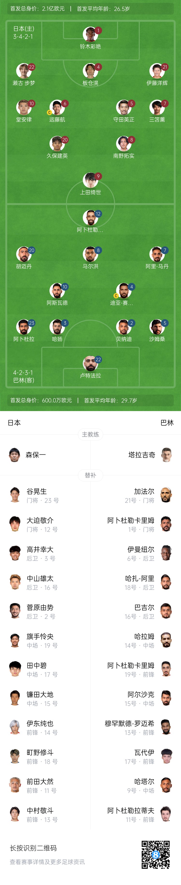 日本替补:12-大迫敬介、23-谷晃生、2-菅原由势、3-高井幸大、11-前田大然、13-中村敬斗、14-伊东纯也、15-镰田大地、16-中山雄太、17-田中碧、18-町野修斗、19-旗手怜央