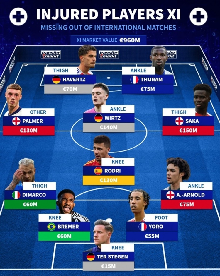 2025-03-20 22:42:00德转列伤缺国家队阵容:萨卡、维尔茨、罗德里在列,总价9.6亿欧