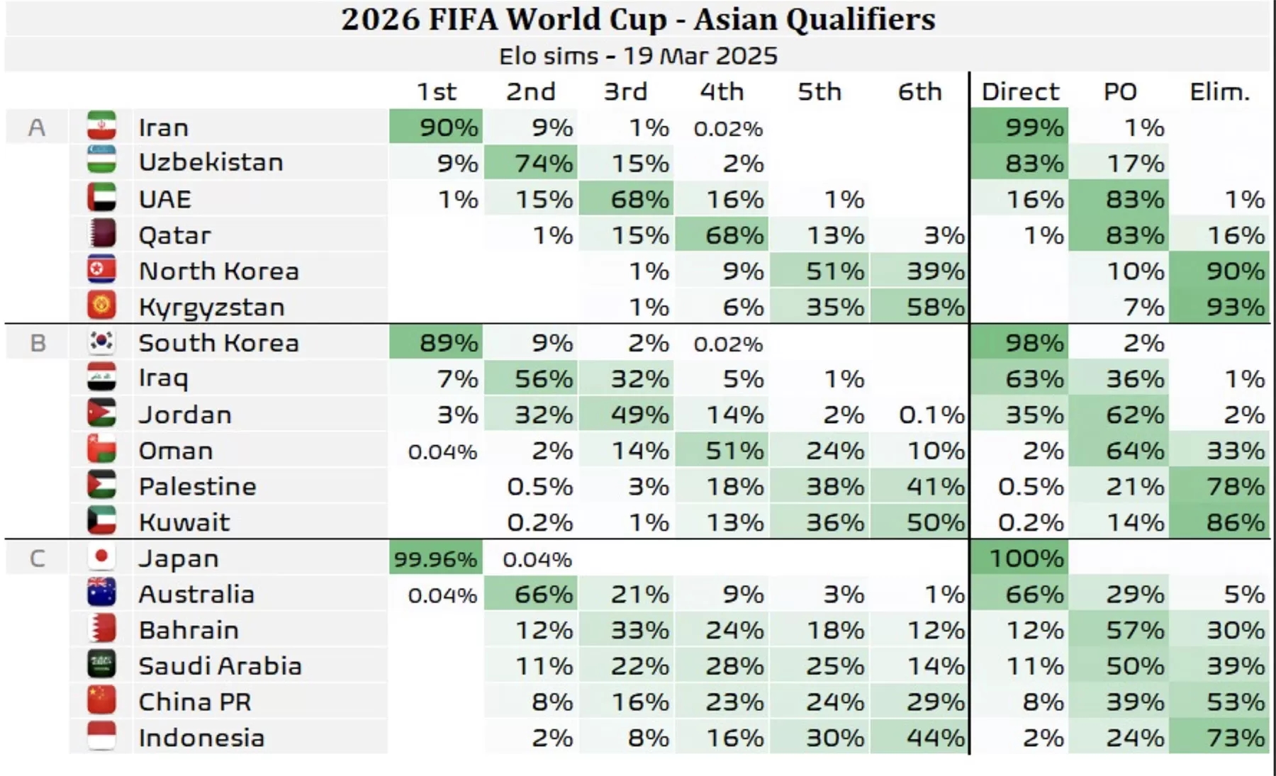 2025-03-20 22:43:0618强赛直通世界杯概率:日韩伊3队稳进 国足仅有8%