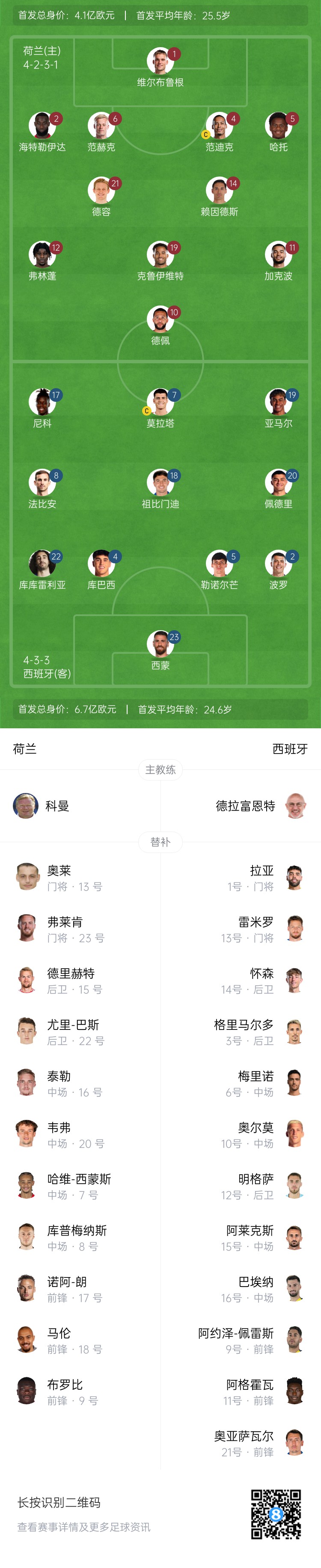 荷兰替补:13-奥莱、23-弗莱肯、7-哈维-西蒙斯、8-库普梅纳斯、9-布罗比、15-德里赫特、16-泰勒、17-诺阿-朗、18-马伦、20-韦弗、22-巴斯