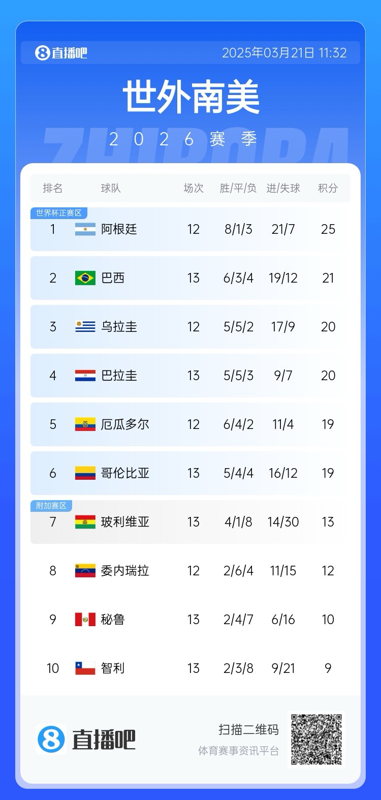 03月21日讯 世预赛南美区第13轮,智利0-1不敌巴拉圭,排名跌至南美区倒数第一,晋级世界杯前景不容乐观。