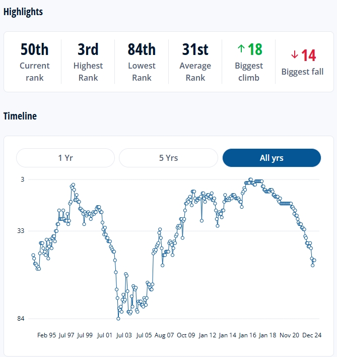 智利的FIFA排名曾在2016年达到队史最高的第3名,从2021年开始,智利的排名就不断下降,最低跌至过第53名,如今为第50名。